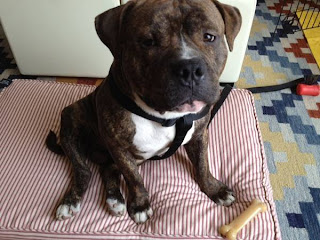 We adopted this little big guy from the Brooklyn Animal Care & Control a week and a half ago. He's a 2 year old American Staffordshire/pit mix, who we think also must have some English Bulldog in him because of his squat stature. He is such a sweet boy. He loves to be a couch potato and get belly rubs.